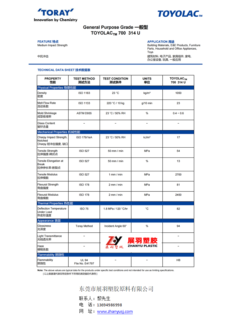 ABS 東麗 Toyolac 700 314 U 中等沖擊 建筑材料 電子產(chǎn)品 辦公室設(shè)備 玩具應用