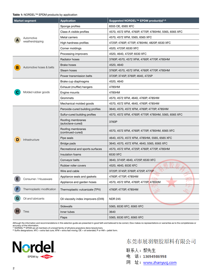 NORDEL™IP 3640碳?xì)湎鹉z是一種無定形的、低含二烯的乙烯-丙烯-二烯三元共聚物(EPDM),適用于耐熱過氧化物固化型材。NORDEL IP 3640可與丁基橡膠混合,以提高汽車和自行車輪胎內(nèi)管的加工和硫化性能。