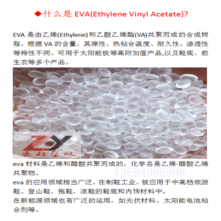 EVA是乙烯和醋酸共聚而成的,中文化學(xué)名稱:乙烯-醋酸乙烯共聚物(乙烯-乙酸乙烯共聚物),英文化學(xué)名稱:Ethylene Vinyl Acetate Copolymer 。EVA的應(yīng)用領(lǐng)域相當廣泛,我國每年的市場消費量都在不斷地增加,尤其在制鞋工業(yè),被應(yīng)用于中高檔旅游鞋、登山鞋、拖鞋、涼鞋的鞋底和內(nèi)飾材料中。在新能源領(lǐng)域也有廣泛的運用,如光伏材料、太陽能電池粘合劑等。