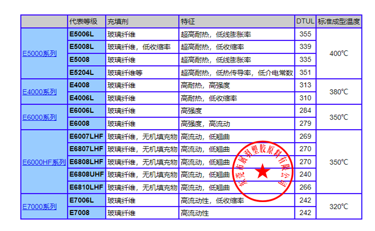 ● E5000和E4000系列,不僅耐熱性高,而且所需成型溫度也高,故需把成型機(jī)調(diào)到高溫以及對成型機(jī)頻繁維護(hù)。因此只限于高溫浸焊(>350℃)等高耐熱要求時(shí)使用。另外,當(dāng)準(zhǔn)備采用這些等級時(shí),請咨詢弊公司后選擇產(chǎn)品系列。