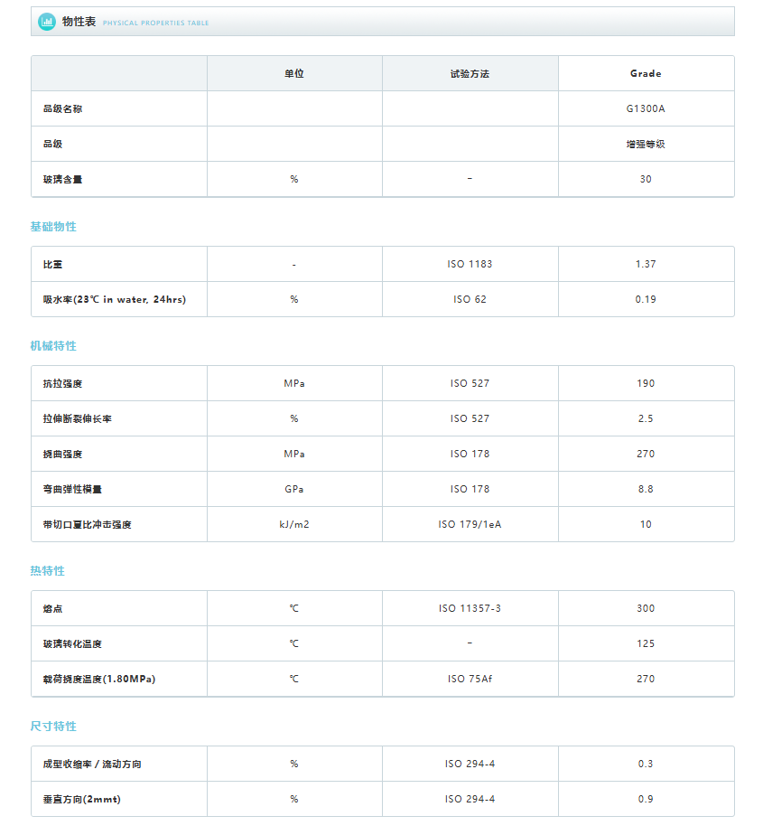 GENESTAR? G1300A 由日本可樂麗 生產(chǎn),是一種以30%玻璃纖維增強的耐熱聚酰胺9T (PA 9T) 等級。具有低吸水性、良好的尺寸穩(wěn)定性和高溫性能。適用于注塑成型加工。