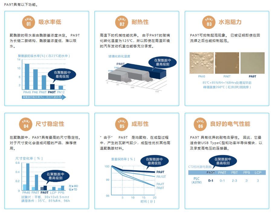 GENESTAR?是低吸水性的耐熱聚酰胺樹脂,其優(yōu)異的成型性、機械物性、耐回流性獲得好評,用于以SMT連接器為代表的各種電子零部件中。