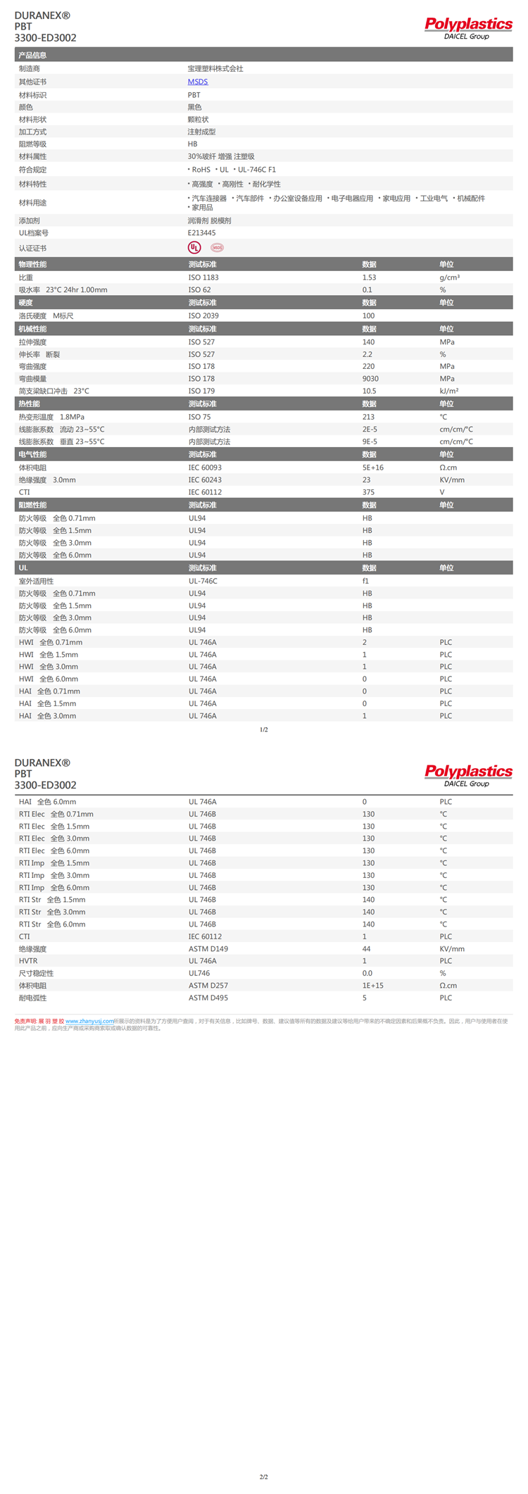 DURANEX? PBT 3300-ED3002 日本寶理 GF30 聚對苯二甲酸丁二醇酯