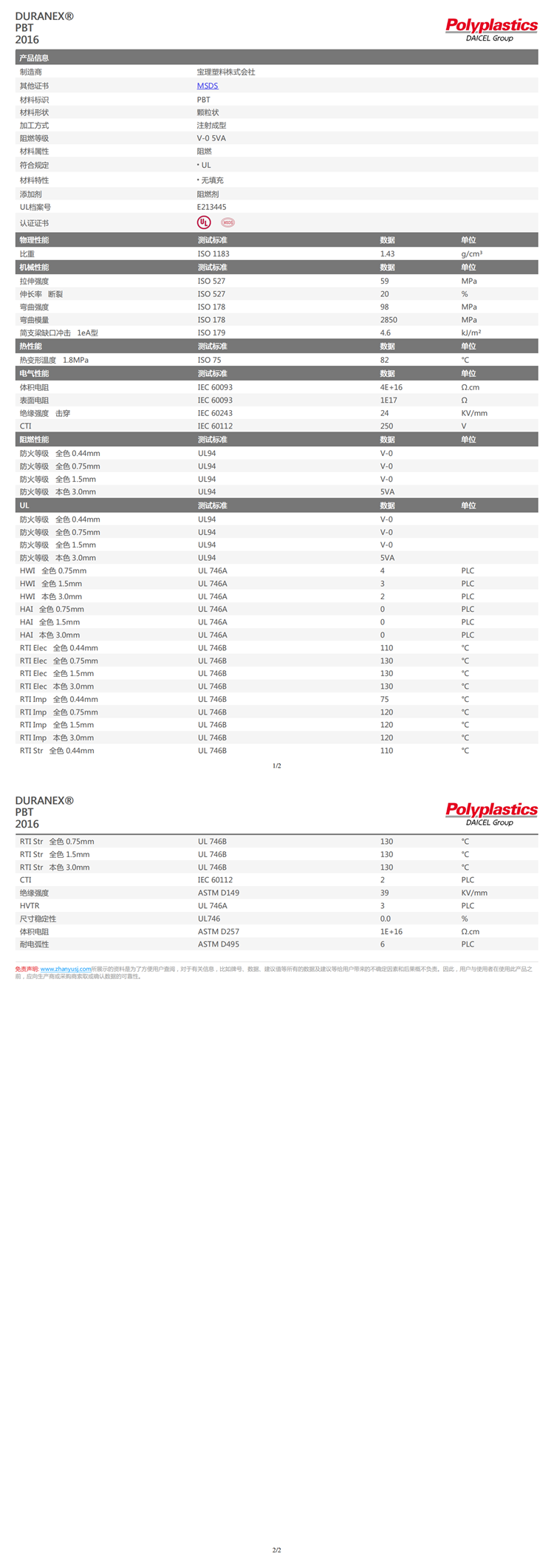 寶理 DURANEX® PBT 2016 無填充 阻燃 V-0 聚對(duì)苯二甲酸丁二醇酯