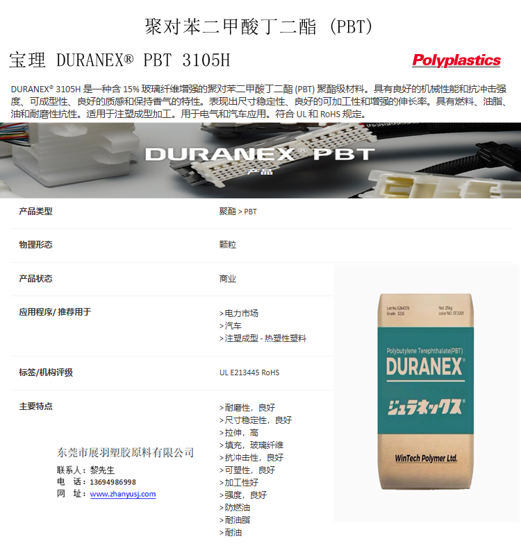 寶理 DURANEX® PBT 3105H 玻璃纖維15% 高流動性 高韌性 防燃油 電氣和汽車應用 東莞市展羽塑膠原料有限公司