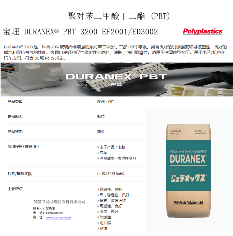寶理 DURANEX® PBT 3200 玻纖GF20 耐油脂 耐磨性 聚對苯二甲酸丁二酯