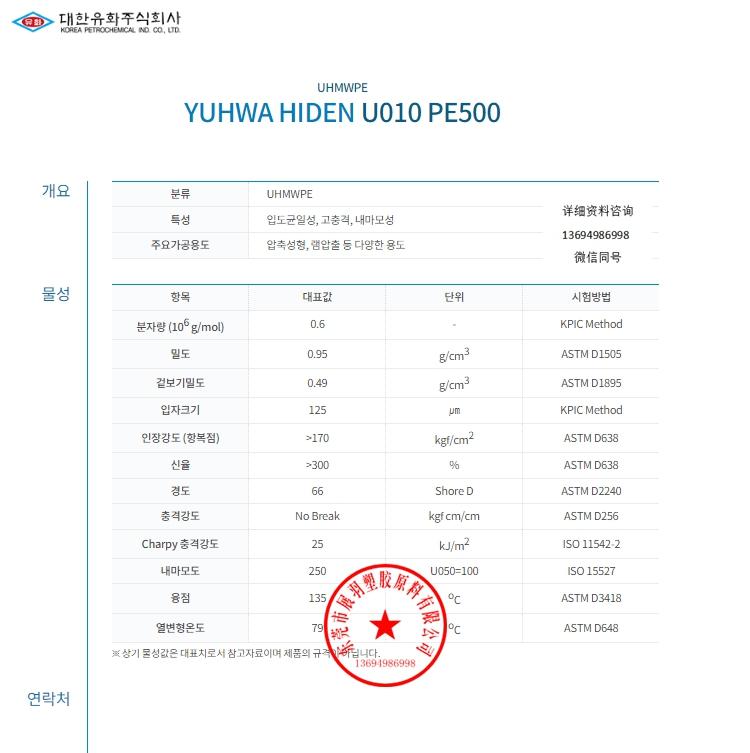 UHMWPE 大韓油化 YUHWA HIDEN U010 PE500 超高分子量聚乙烯