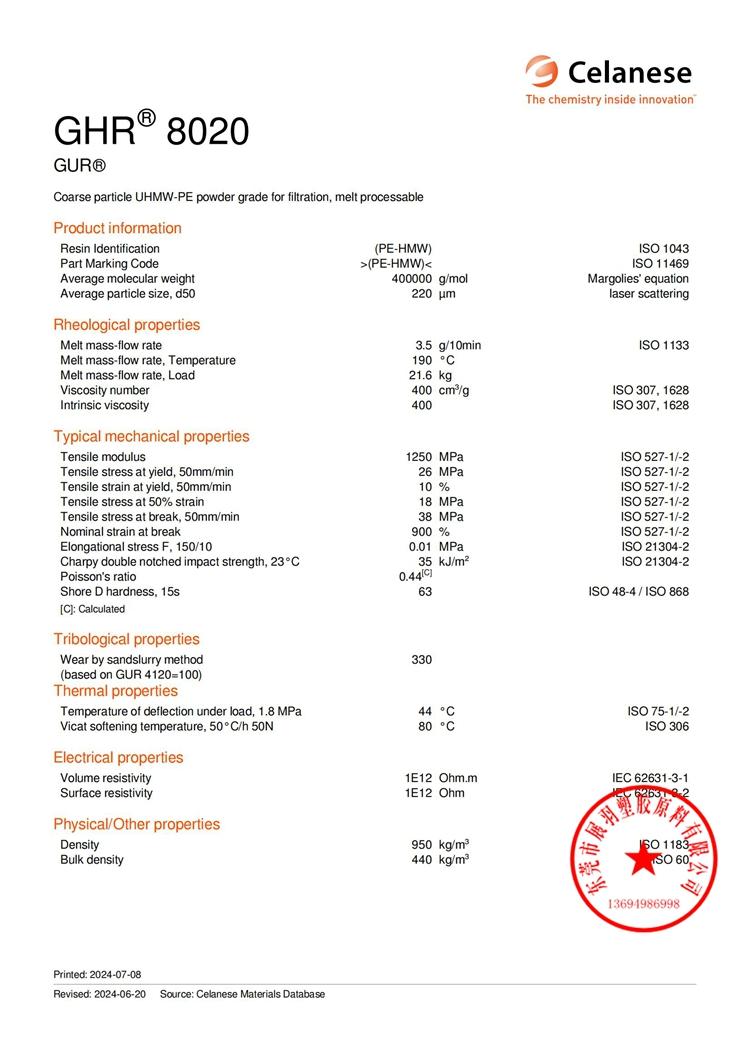 GUR? GHR 8020 by Celanese is a linear high density polyethylene (HDPE) grade with a molecular weight of approximately 400,000 g/mol calculated using Margolies equation. Designed for compression molding process. It is mainly used for production of porous products. GUR? GHR 8020 complies with UL 94 HB Flame Rating.