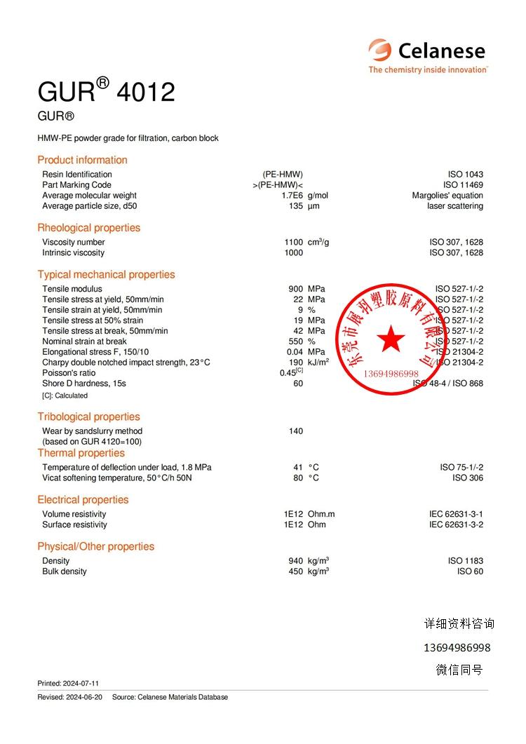 超高分子量聚乙烯 塞拉尼斯 GUR 4012 (聚乙烯-HMW) UHMW-PE粉末級