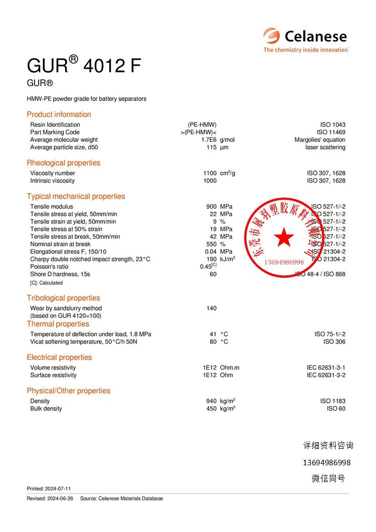 塞拉尼斯 GUR 4012 F 超高分子量聚乙烯 電池隔膜用 UHMWPE 粉末級