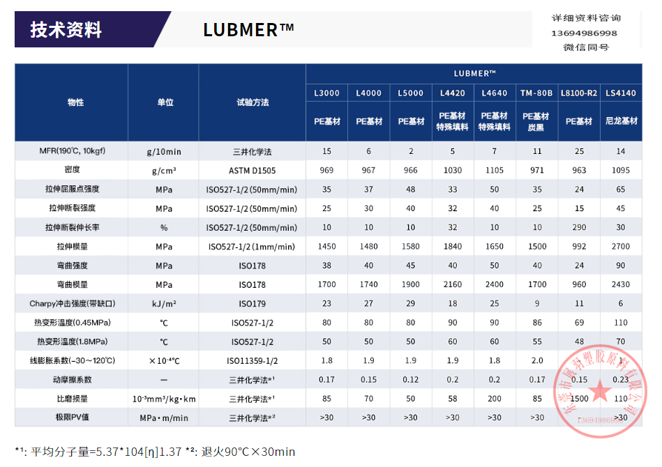 三井化工公司研制的高分子量電絕緣聚乙烯級(jí)LUBMER L3000。具有噪聲阻尼,食品安全,滑動(dòng)性能,良好的化學(xué)和耐磨性。適用于汽車配件、齒輪、軸承、滾輪、鍵盤柱塞和安全帶配件.其他應(yīng)用包括玻璃流道、助攻器、一般設(shè)備配件和建筑材料.L3000是一種高性能和可靠的等級(jí)。它可以通過共擠壓和注塑加工。