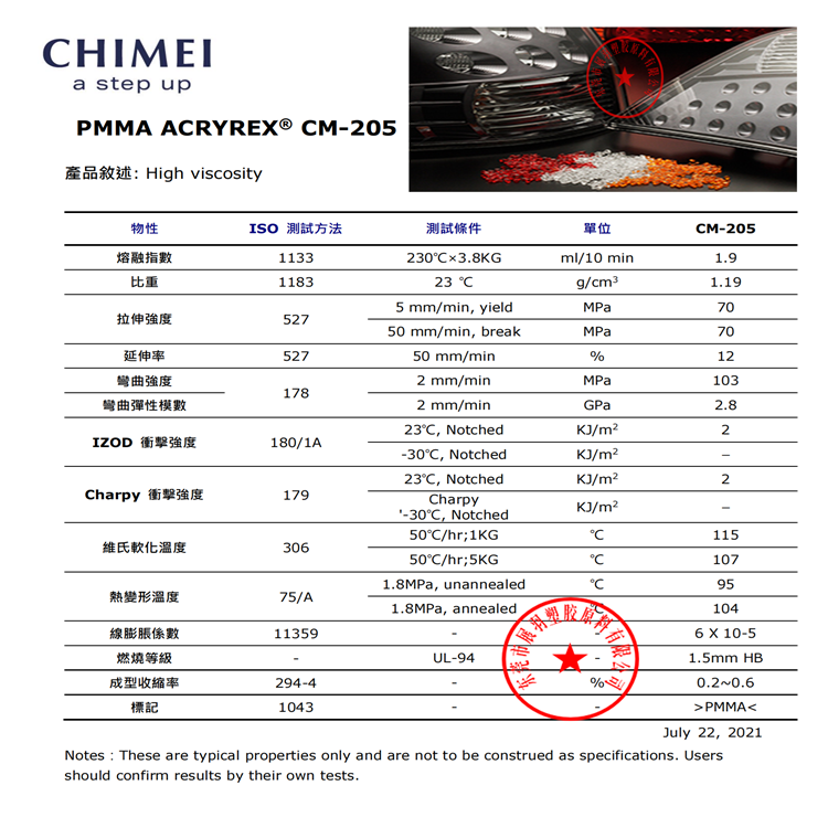 臺灣奇美ACRYREX® CM-205 是一種高粘度聚甲基丙烯酸甲酯 (PMMA) 牌號。具有耐熱、耐高溫、熱變形溫度高達 100°C 和堅韌的機械強度。具有潔凈度好、透明度和光澤度高、物理、化學、光學、電學性能穩(wěn)定等特點。專為注塑和擠出板材、棒材和管材應用而設計。