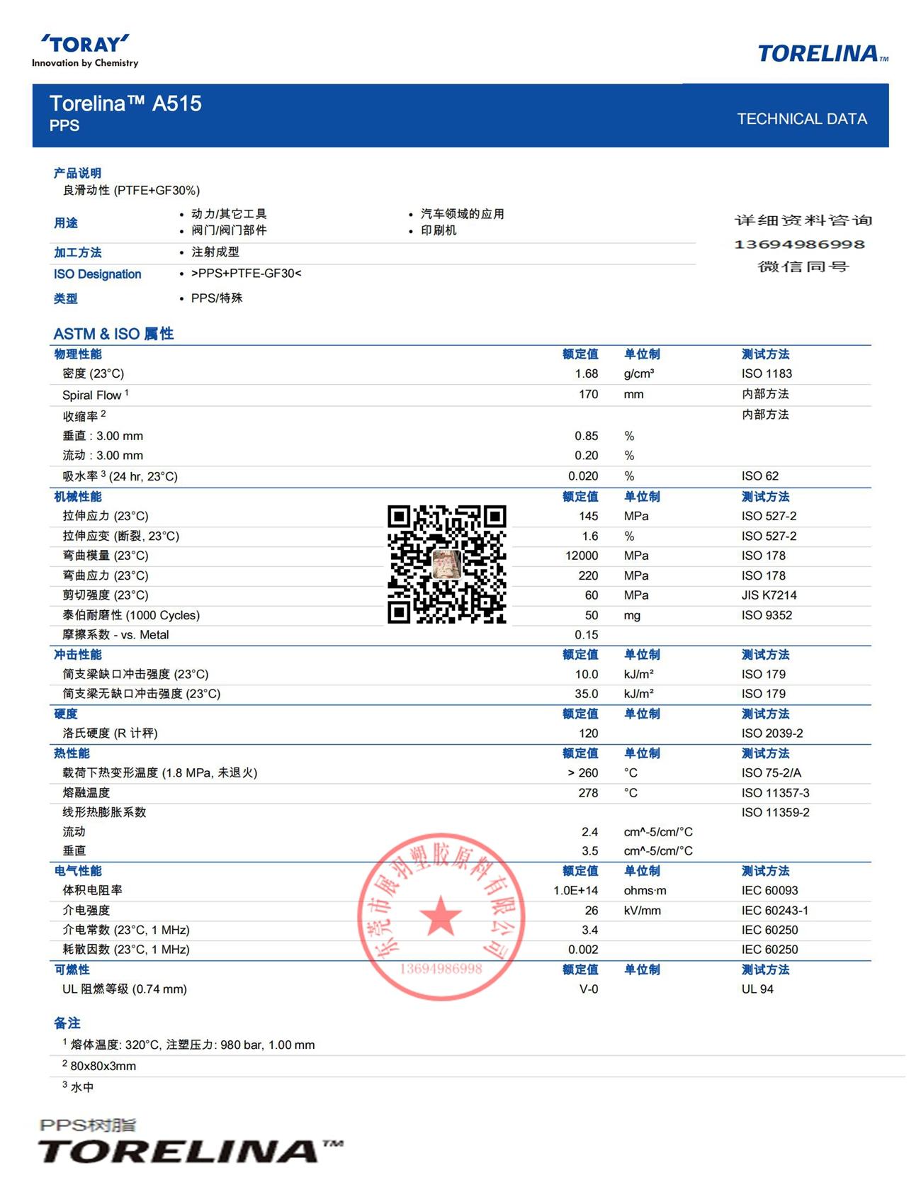TORELINA A515 Toray 日本東麗PPS 良滑動(dòng)性 (PTFE+GF30%) 聚苯硫醚