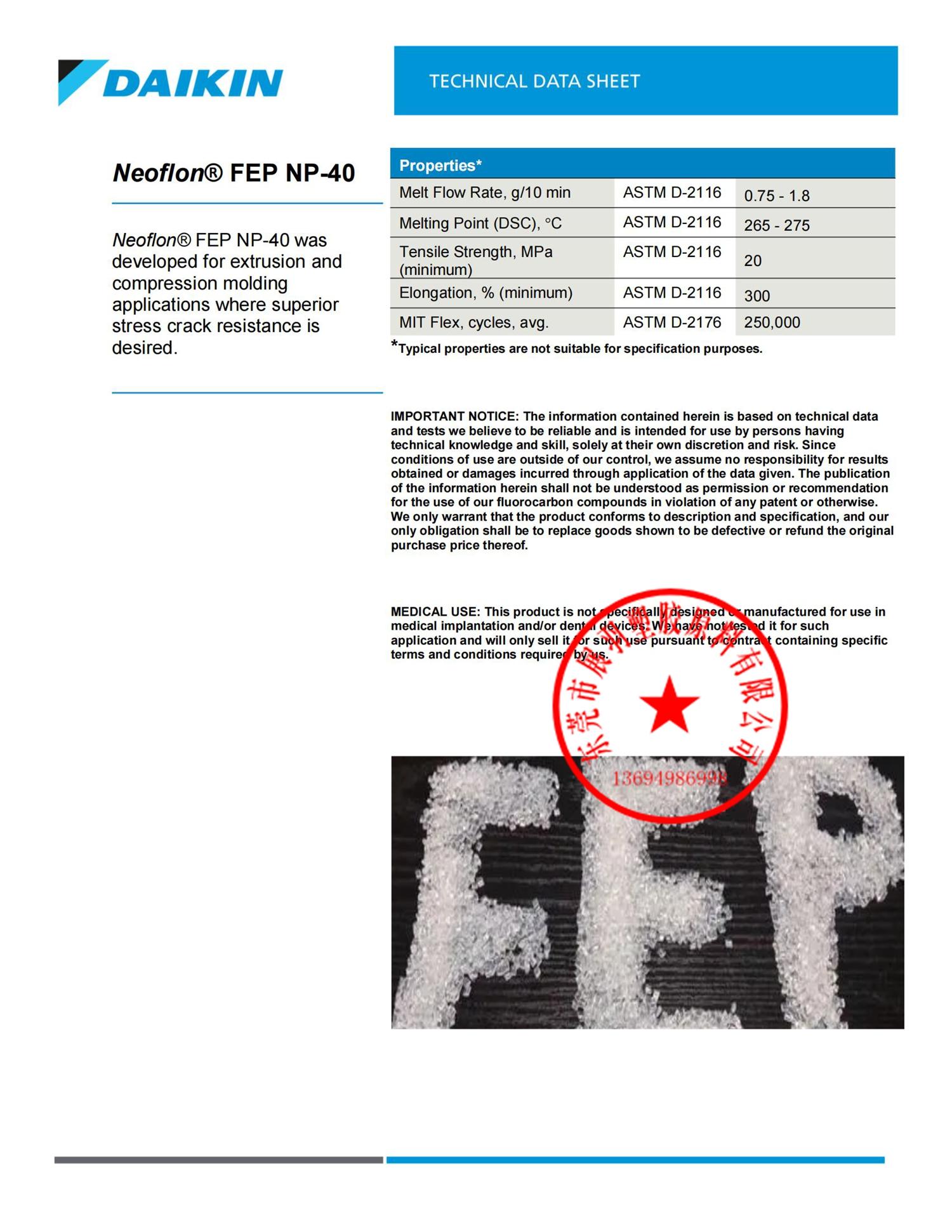 NEOFLON FEP NP-40 新氟聚氯乙烯 應(yīng)力抗裂性 擠壓和壓縮成型