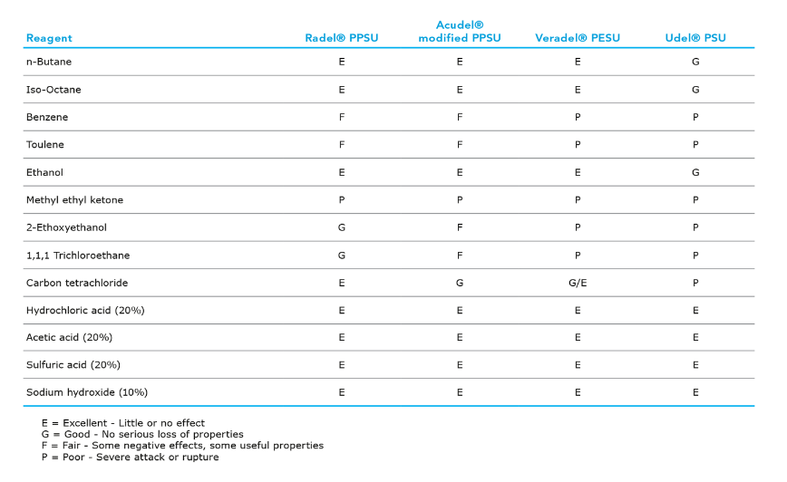 砜類(lèi)聚合物對(duì)許多物質(zhì)具有良好的耐化學(xué)性,包括水體系、腐蝕劑、無(wú)機(jī)酸、脂肪族烴、洗滌劑和肥皂以及某些醇。