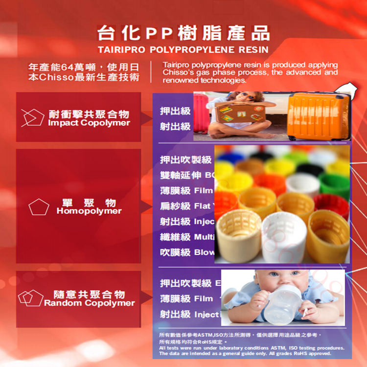 臺(tái)化PP樹脂(TIRIPRO?  PP Resin)采用日本CHISSO氣相制程法,以新一代高活性觸媒,及嚴(yán)密之質(zhì)量管理系統(tǒng),年產(chǎn)達(dá)51萬公噸。可生產(chǎn)單聚物( HOMOPOLYMER),共聚物( RANDOM及IMPACT COPOLYMER),供應(yīng)射出、押出、纖維、吹氣、真空成型等加工業(yè)者,廣泛運(yùn)用于家電、汽車零配件、食品包裝、玩具及民生用品。本廠設(shè)有研發(fā)中心及整套實(shí)驗(yàn)工場(chǎng),有能力進(jìn)行新規(guī)格開發(fā)及加工技術(shù)服務(wù)。本廠生產(chǎn)設(shè)備采嚴(yán)格環(huán)保標(biāo)準(zhǔn),且生產(chǎn)技術(shù)成熟穩(wěn)定,無污染環(huán)境之疑慮。廢氣經(jīng)高溫燃燒,熱量予以回收。聚合制程則無廢水產(chǎn)生。