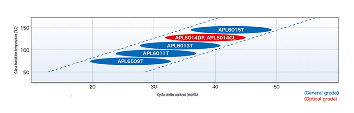 APEL環(huán)烯烴共聚物有七個等級,具有很強的透明度、水蒸氣阻隔性和耐熱變形性。其中五個牌號適用于通用應用,較低的 Tg 牌號適用于薄膜擠出。兩個牌號適用于光學應用和注塑成型應用。所有牌號均表現(xiàn)出良好的熱性能、介電性能和電性能、低收縮率和低吸濕性。